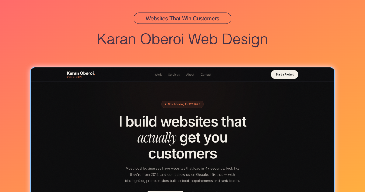 Most local businesses have websites that load in 4+ seconds, look like they're from 2015, and don't show up on Google. I fix that — with blazing-fast, premium sites built to book appointments and rank locally.